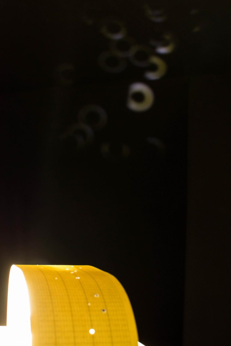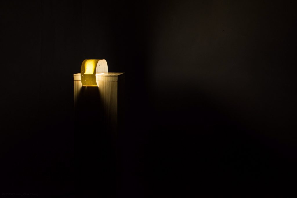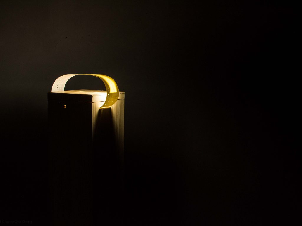 作品裝置為自製的打孔紙帶音樂盒,並在音樂盒中置入光源,使光線可以透過孔洞在展覽空間中呈現出像泡泡一樣的光圈。其中因為要足夠大的孔洞才能觸發音樂盒的聲音機制,所以我在紙帶上也打上了許多更小的孔洞,形成一些不能發出聲音,卻可以透出光圈的效果。而能發出聲音的部分,則是將生日快樂歌的旋律打散。參與者聽到聲音的同時,也感覺到許多空白,如第三個願望沈默的部分。